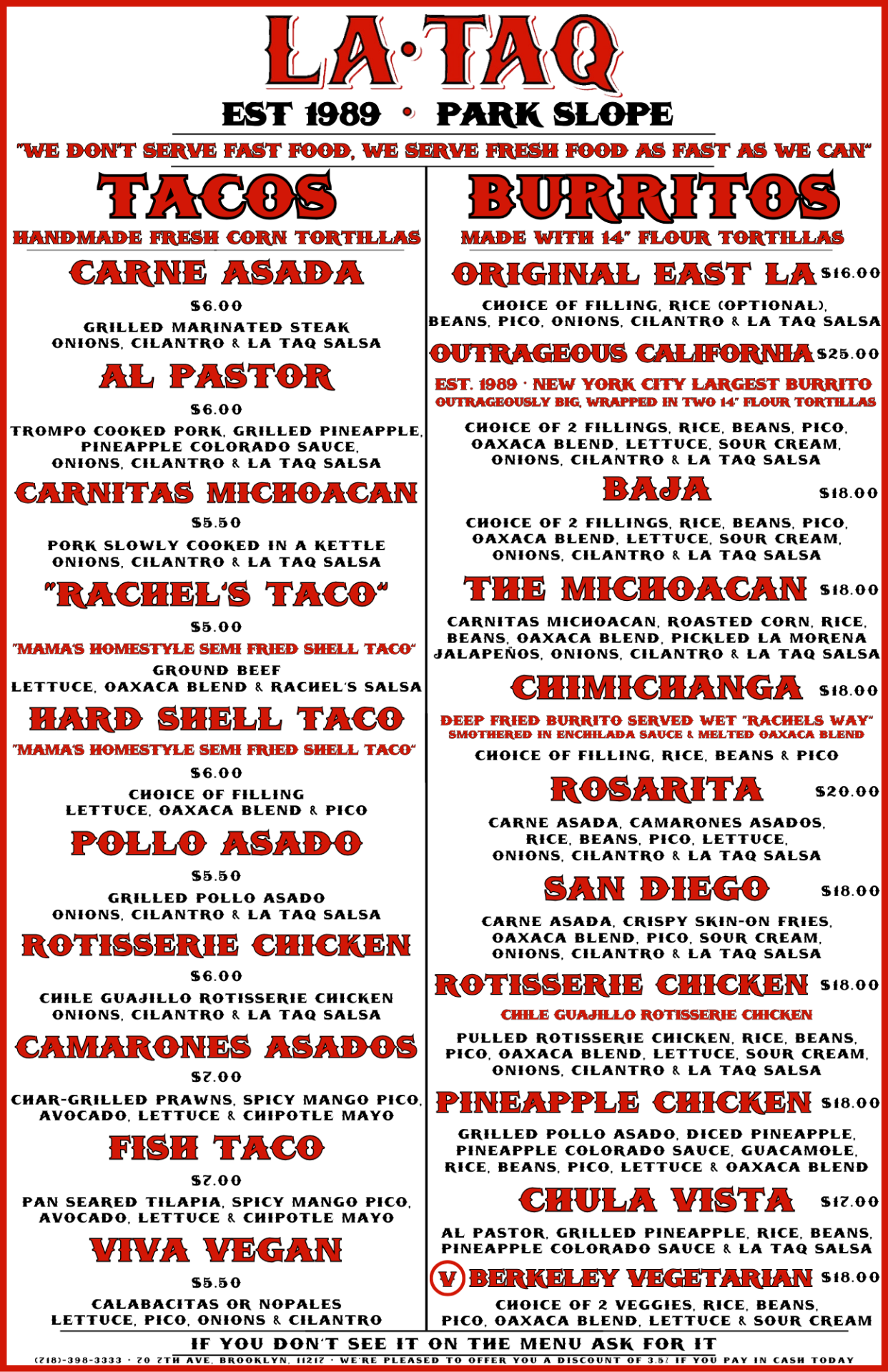 Served with 10 Handmade Fresh Corn Tortillas, Rice, Beans & LA TAQ Salsa