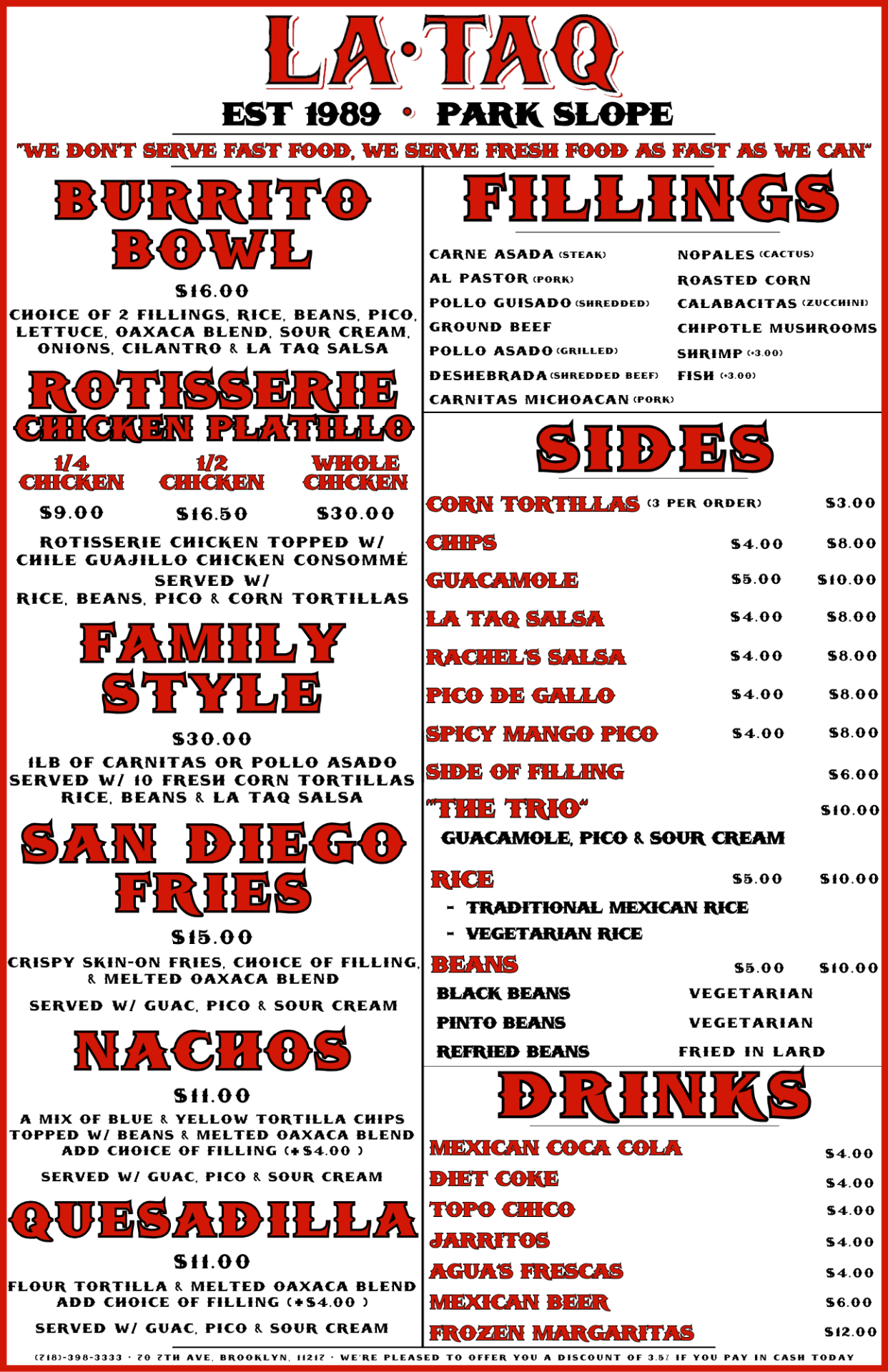 Choice of 2 fillings, Rice, Beans, Pico De Gallo, Lettuce, Oaxaca blend, Sour Cream, Onions, Cilantro & LA TAQ Salsa
