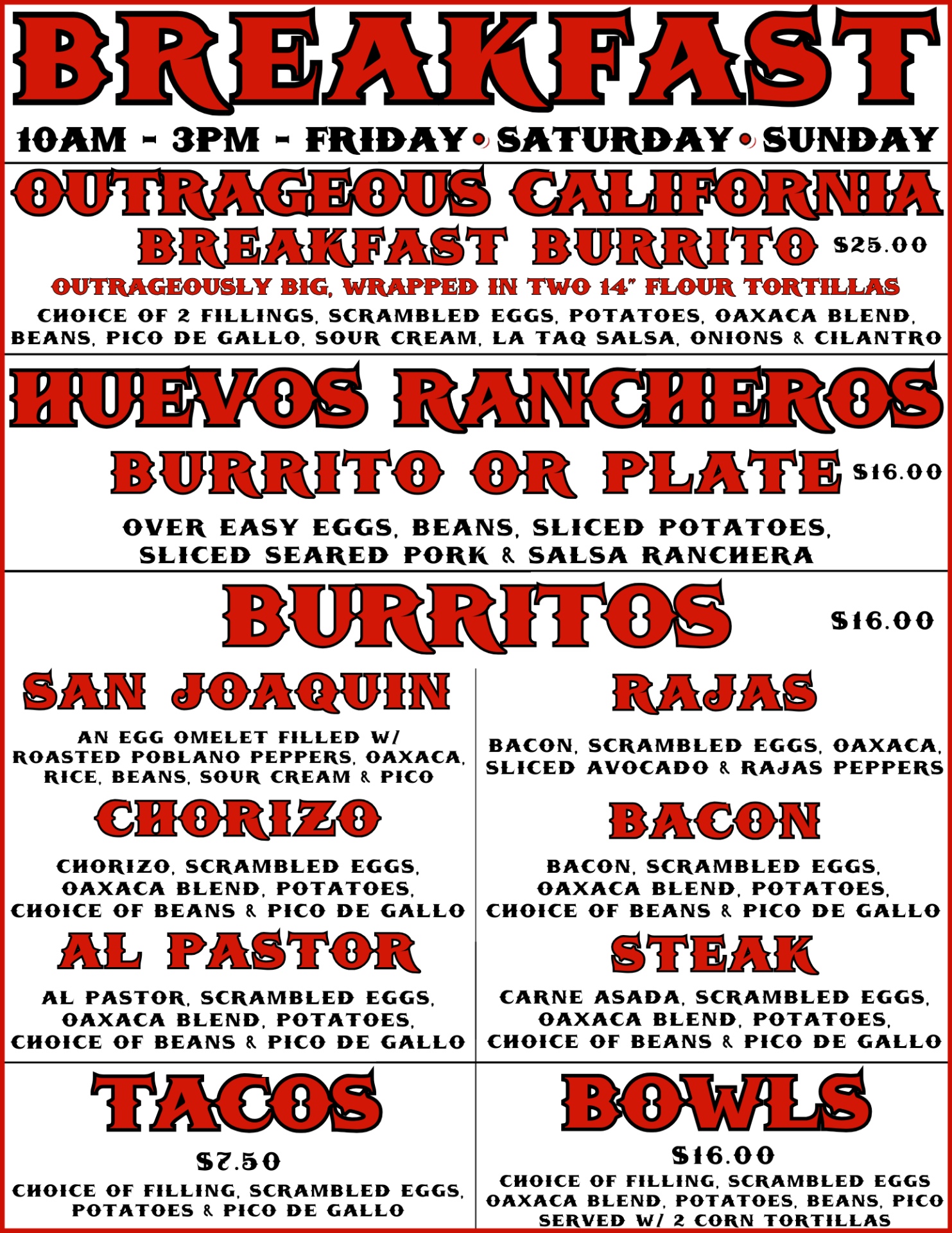 Outrageous California Breakfast Burrito - Outrageously Big, wrapped in two 14" flour tortillas, Choice Of 2 fillings, Scrambled eggs, Potatoes, oaxaca blend, beans, Pico de gallo, sour cream, La TAQ Salsa, Onions & Cilantro